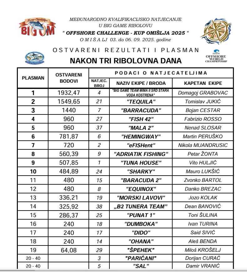 Na Rivi Ivana Pavla II u Omišlju završeno je jubilarno, 20. izdanje međunarodnog kvalifikacijskog turnira u lovu na veliku ribu BIG OM, jednog od najstarijih i najznačajnijih big game fishing natjecanja na Jadranu. Ovogodišnje izdanje privuklo je 40 ekipa i oko 160 sudionika iz Hrvatske i inozemstva (Italija, Slovenija, Njemačka, Danska, Austrija, BiH i Srbija), a tijekom tri dana ribolova ulovljeno je ukupno 787,41 kilogram tune.